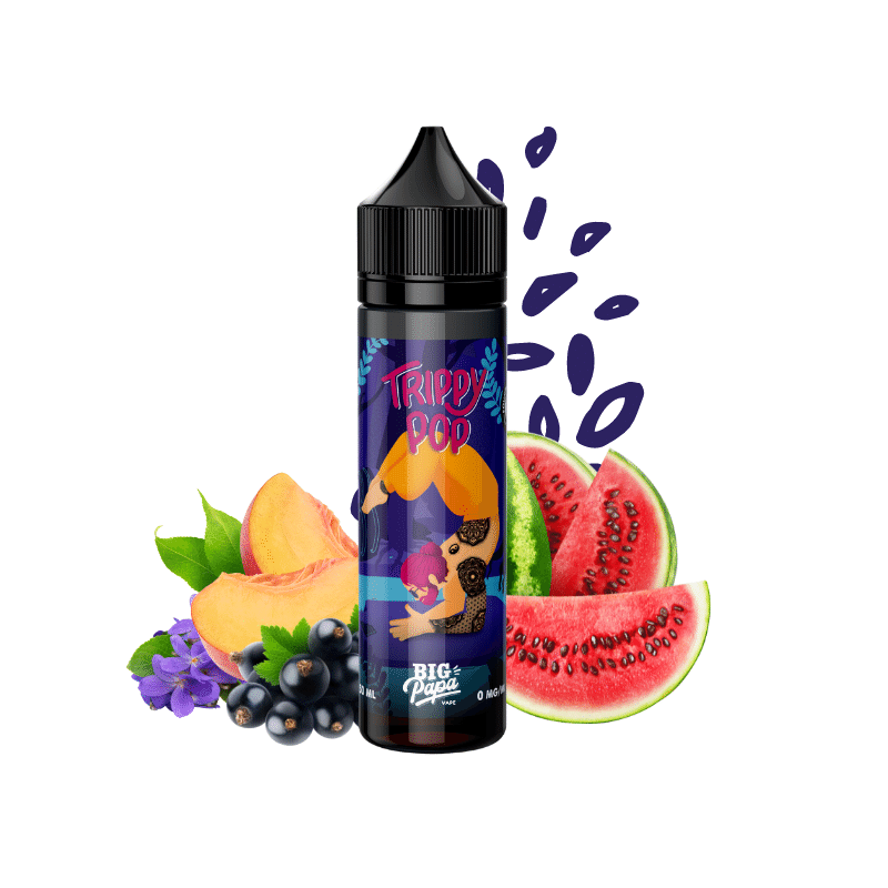 Big Papa revient avec un eliquide terriblement fruité ! Le liquide Trippy Pop a été conçu pour répondre aux attentes des amoureux de recettes hypnotisantes où les fruits sont les stars. A un subtil jus de pastèque, Big Papa a greffé une poignée de cassis acidulés et des pêches sucrées. Les ingrédients qui composent cet elixir addictif sont rehaussés par la présence de quelques pétales de violette !